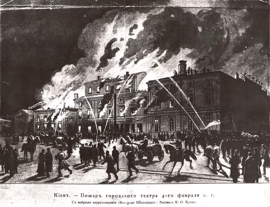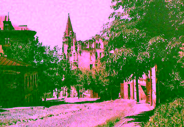 Lex Другий міський театр на розі Володимирської та Кадетської (Богдана Хмельницького). Згорів в останній день сезону 5 лютого 1896 року. Світлина 1985 року.