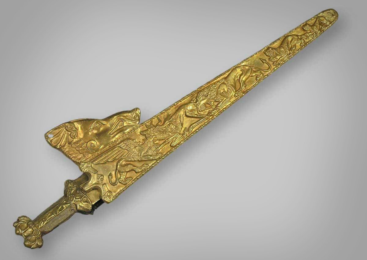 Bahati Меч із золотими прикрасами руків’я та піхов. Остання третина IV століття до н. е. Курган поблизу села Велика Білозерка (Запорізької область). Розкопки 1979 року. Зараз зберігається в Музеї історичних скарбів України.
