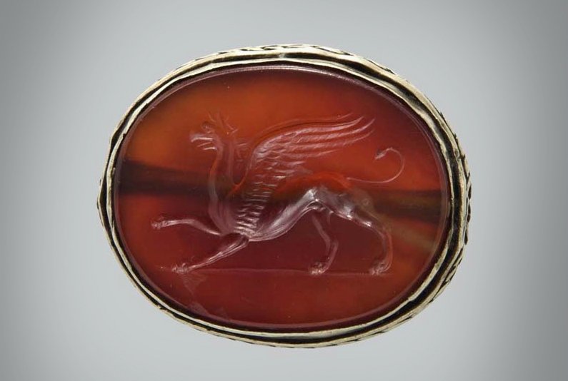 Bahati Гема в золотій оправі (кінець V століття до н. е.). З кургану "Гайманова Могила" поблизу села Балки, Запорізької області. Розкопки 1970 року. Зараз зберігається в Музеї історичних скарбів України.