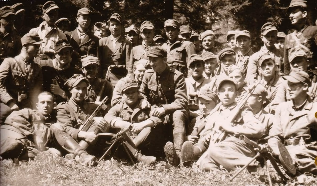 vidish Чота повстанців під командуванням Ярослава Коцьолока - "Крилача" (в центрі). Світлина весни 1945 року.