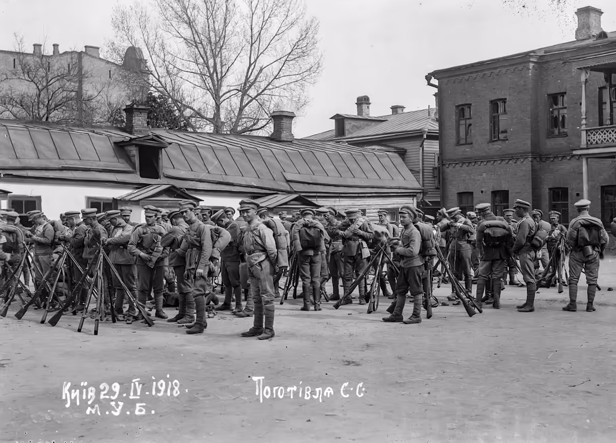 vidish Курінь Січових Стрільців під командуванням Євгена Коновальця, Київ. Автор С.С. Музика. Світлина 30 квітня 1918 року.
