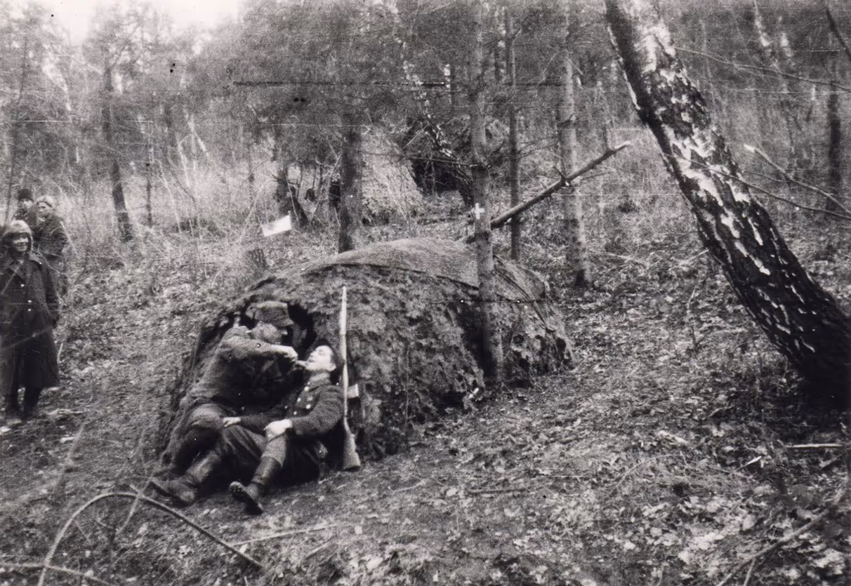 vidish Санітарний пункт сотні УПА “Ударник 4” (вд.94а) в лісі між сс.Кописно–Конюша–Брилинці (Перемищина), весна 1947. На передньому плані ліворуч санітар сотні “Ударник 4” старший булавний Михайло Василик-“Кивай”, праворуч зв’язковий “Славко”.