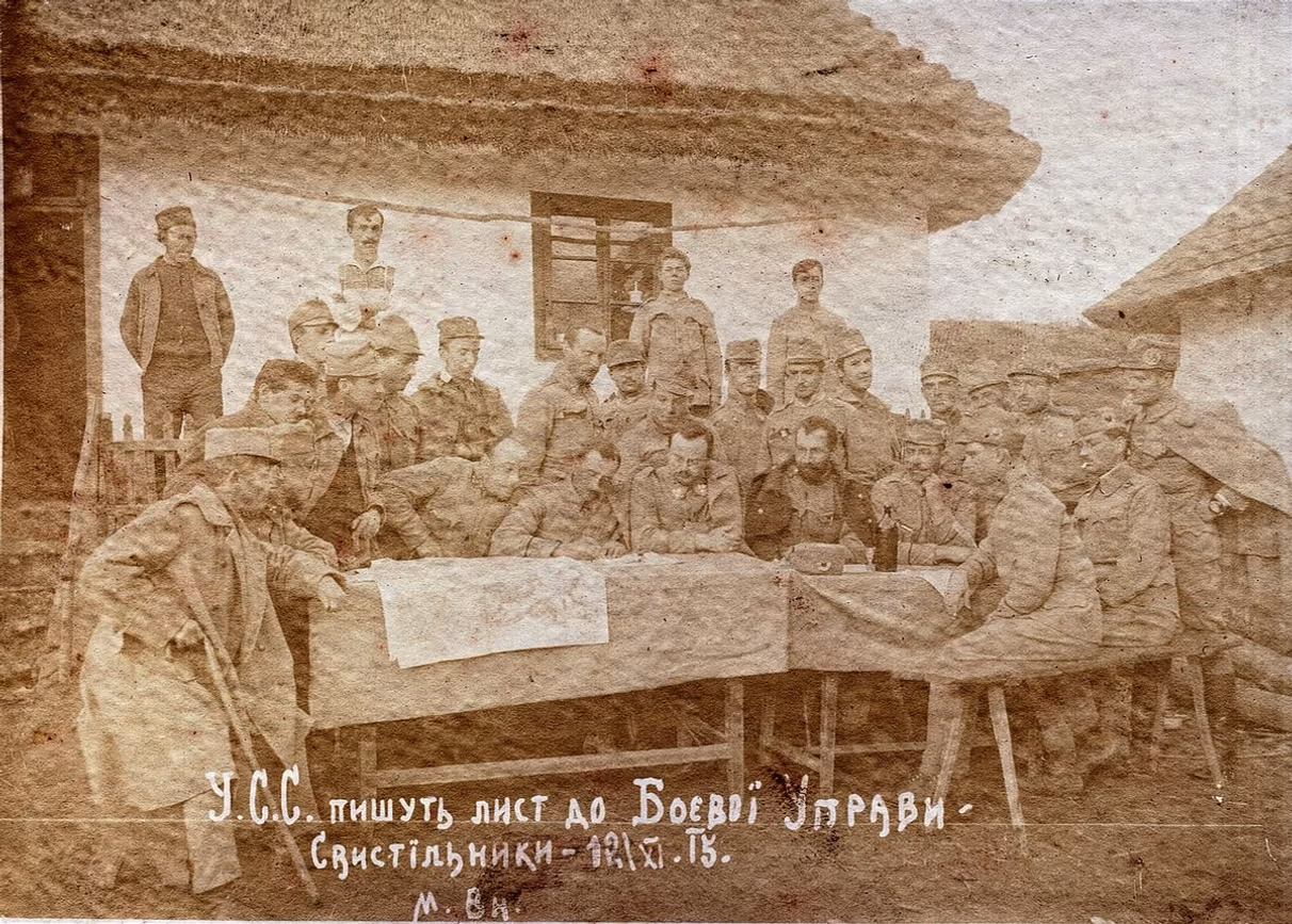 vidish Стрільці Легіону УСС пишуть лист до Боєвої Управи. Свистільники 12 листопада 1915 року. Світлина зі збірки музею Миколи Угрина-Безгрішного в Рогатині.