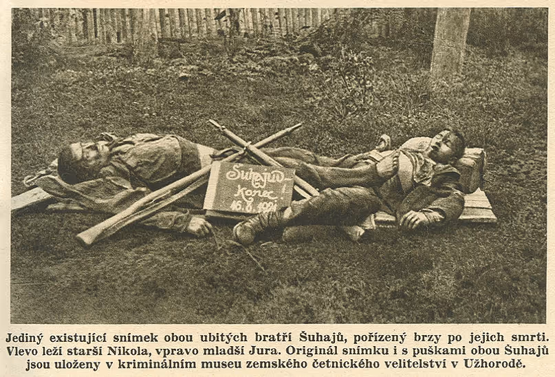 vidish Вбиті перекупленими колишніми товаришами легендарний український закарпатський народний месник Микола Шугай та його брат Юрій. Світлина 16 серпня 1921 року.