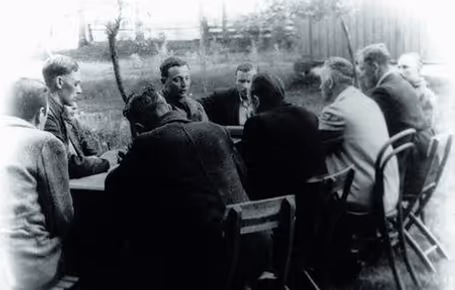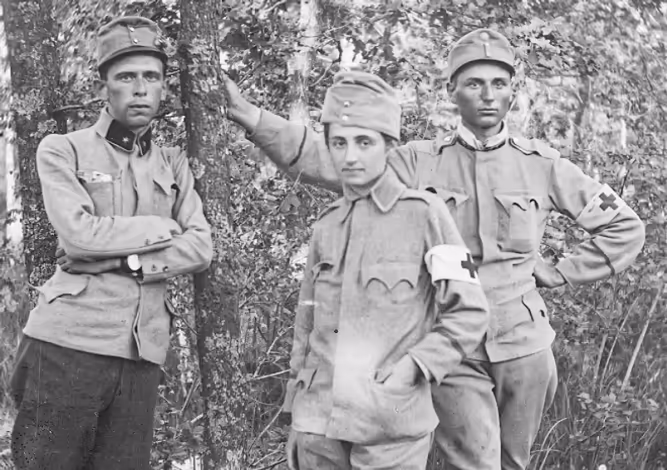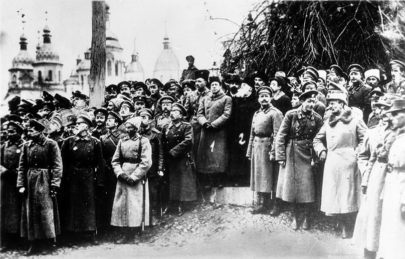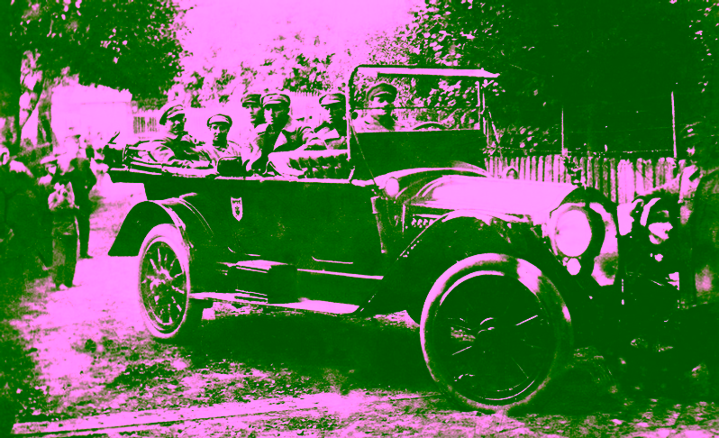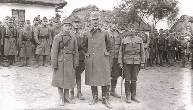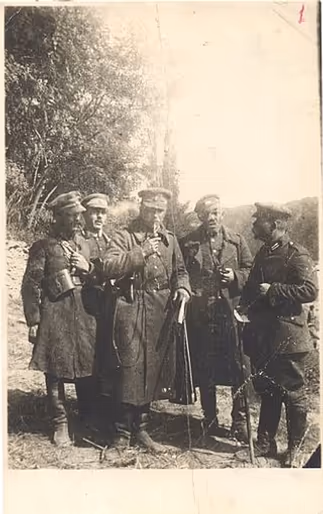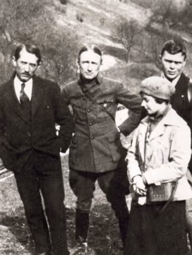 Зліва направо сидять: 2-й Михайло Матчак, далі Марко Безручко, Євген Коновалець, Юрій Отмарштейн, Роман Сушко.Відвідини Євгеном Коновальцем штабу 11-її дивізії Січових стрільців (командир Роман Сушко).