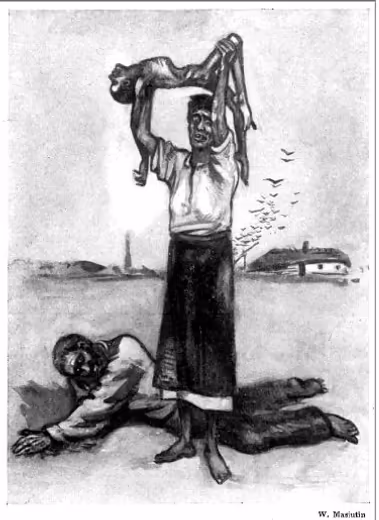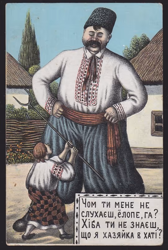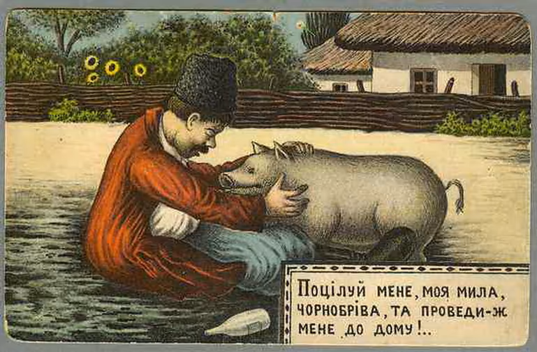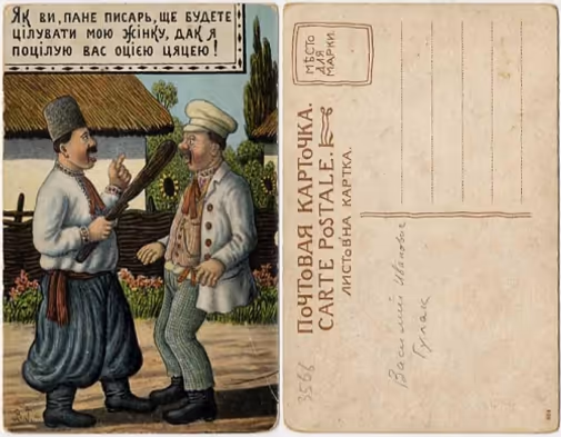 Поштівка "Як ви, пане писарь, ще будете цілувати мою жінку, дак я поцілую вас оцією цяцею!" з малюнком Василя Івановича Гулака, який співпрацював з київськими періодичними виданнями "Київське життя", "Київська думка", сатиричним журналом "Цвях". Художник підтримував демократичні ідеї. У період революції 1905-1906 років створював малюнки, що критикують правлячий уряд. У числі його робіт були сентиментально-зворушливі з українськими видами, ілюстрації до віршів, політичні, агітаційні, сатиричні, але більше гумористичних і карикатурних, близьких і зрозумілих простому народу. Створювалися і публікувалися малюнки в різні роки до революції. Відомо, що в 1918 році була видані листівки з малюнками Гулака. Можливо, щось публікувалося до цього. У 1964 році був репринт листівок 1918 року: Василь Гулак. Передруковане видання 1918 року. Віддруковано у Стрийський міський друкарні 1964 р.